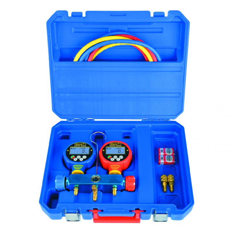 Цифровая манометрическая станция DSZH WK-6882L представляет собой двухвентельный цифровой манометрический коллектор с комплектом из трех зарядных шлангов и смотровым стеклом, поставляется в пластиковом кейсе. Цифровой мановакуумметр WK-6882. В памяти у него температуры кипения по 82 хладагентам, можно изменять единицы измерения температуры (°C, °F) и давления (кПа, Бар, Psi, торр, кгс/см2, дюйм рт.ст., мм рт.ст.), можно переключать в режим вакуумметра (нажатием и удержанием клавиши "ZERO", в режиме вакуумметра не отображается хладагент и температура - только давление и показывает % от "полного" вакуума).